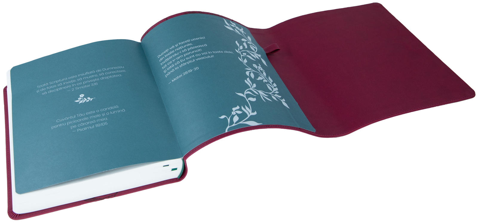 • Marginile albe cu colturi rotunjite, forzatul color imprimat cu versete biblice relevante, asortat cu cele doua semne de carte satinate, sunt elemente care aduc un plus de rafinament.
