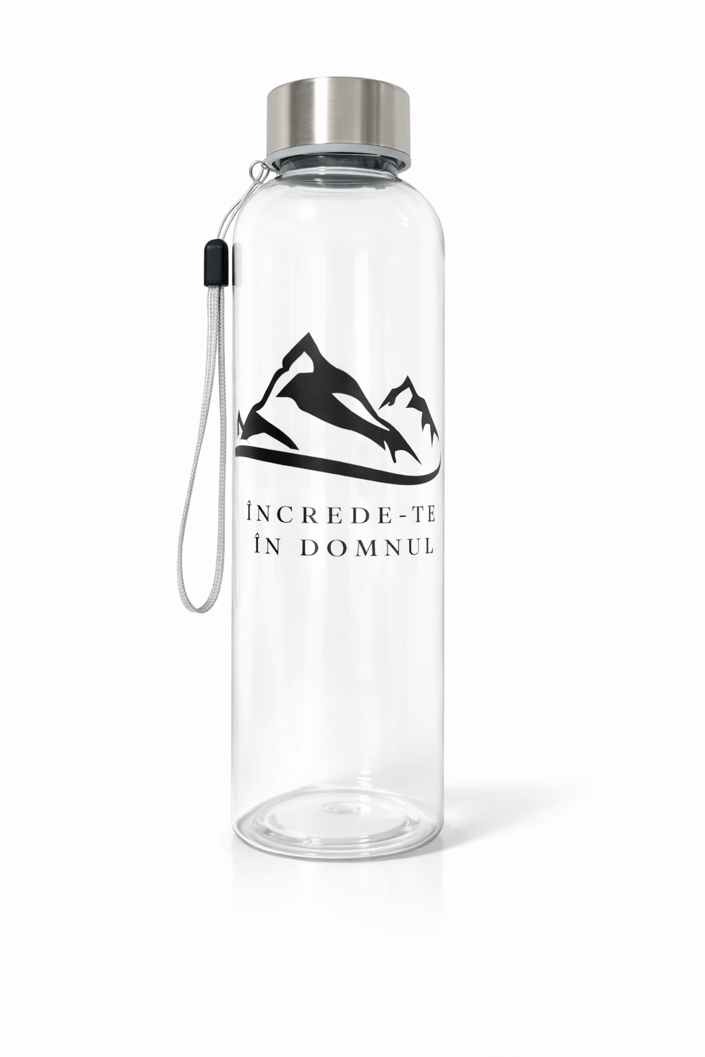 Sticlă de apă din plastic, transparentă cu mesajul: Increde-te in Domnul