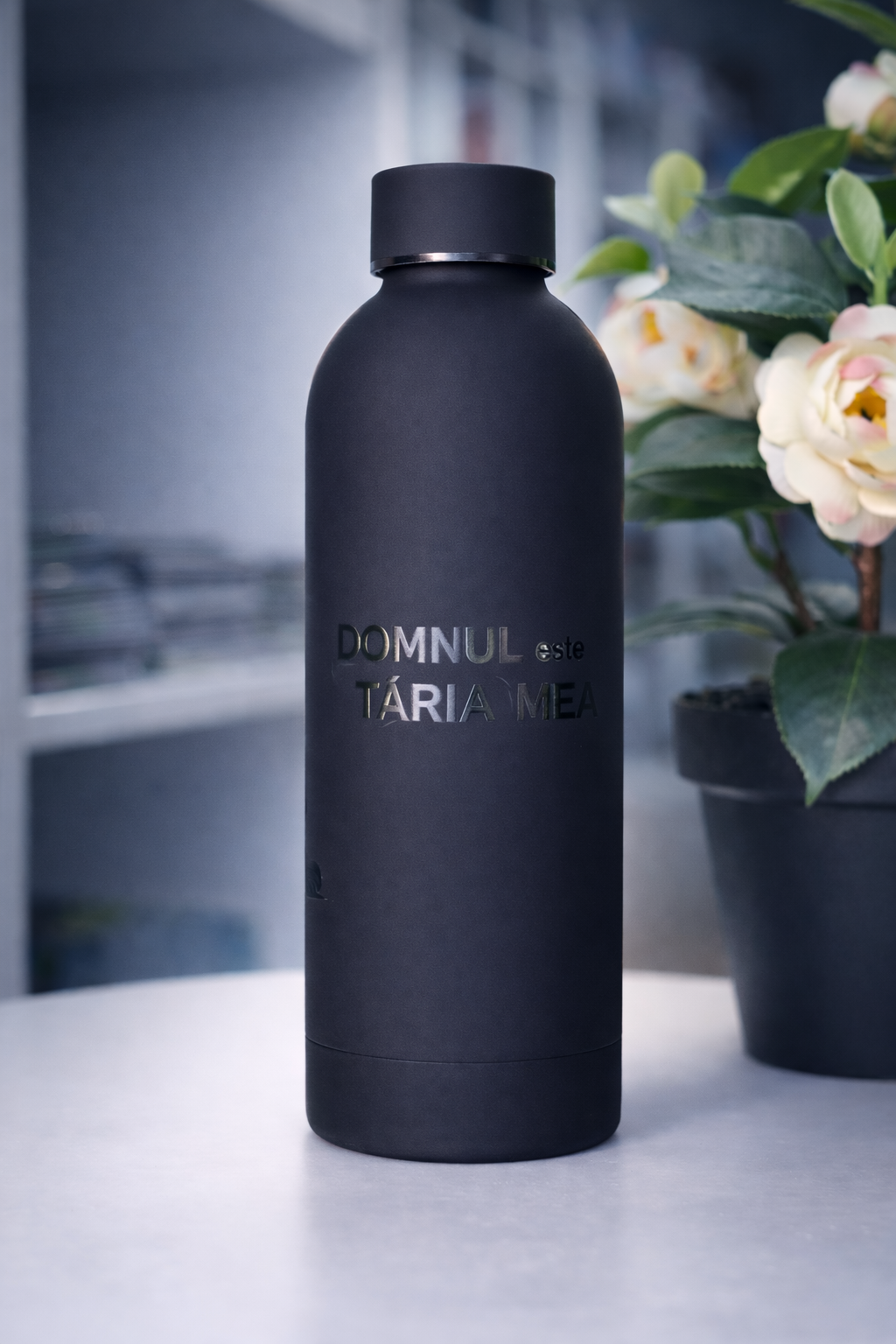 Această sticlă termos din oțel inoxidabil este un accesoriu esențial pentru oricine. Iată un mod de a-ți potoli atât setea (vara sau iarna), cât și încânta sufletul aducându-ți mereu aminte de promisiunile Cuvântului lui Dumnezeu!