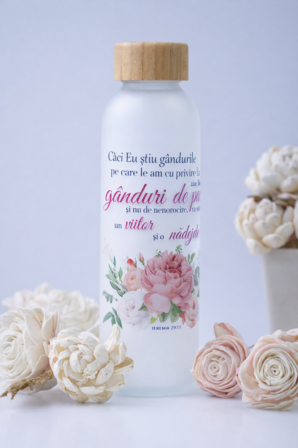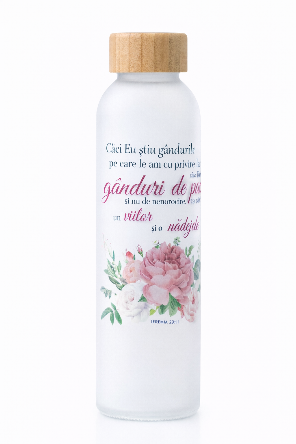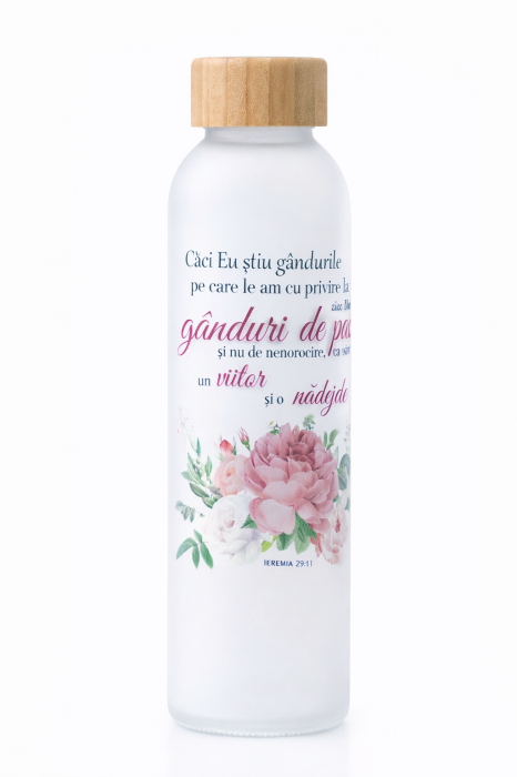Sticlă de apă din sticlă mată cu mesajul: Caci Eu stiu gandurile  (Ieremia 29:11)