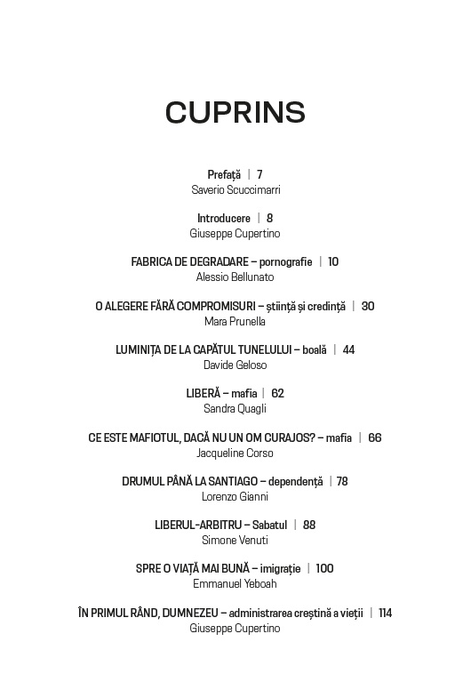 Relatările abordează subiecte variate și actuale precum pornografia (Capitolul „Fabrica de degradare”), știința și credința („O alegere fără compromisuri”), boala („Luminița de la capătul tunelului”), mafia („Liberă” și „Ce este mafiotul, dacă nu un om curajos?”), dependența („Drumul până la Santiago”), Sabatul („Liberul arbitru), imigrația („Spre o viață mai bună”) și administrarea creștină a vieții („În primul rând, Dumnezeu”).
