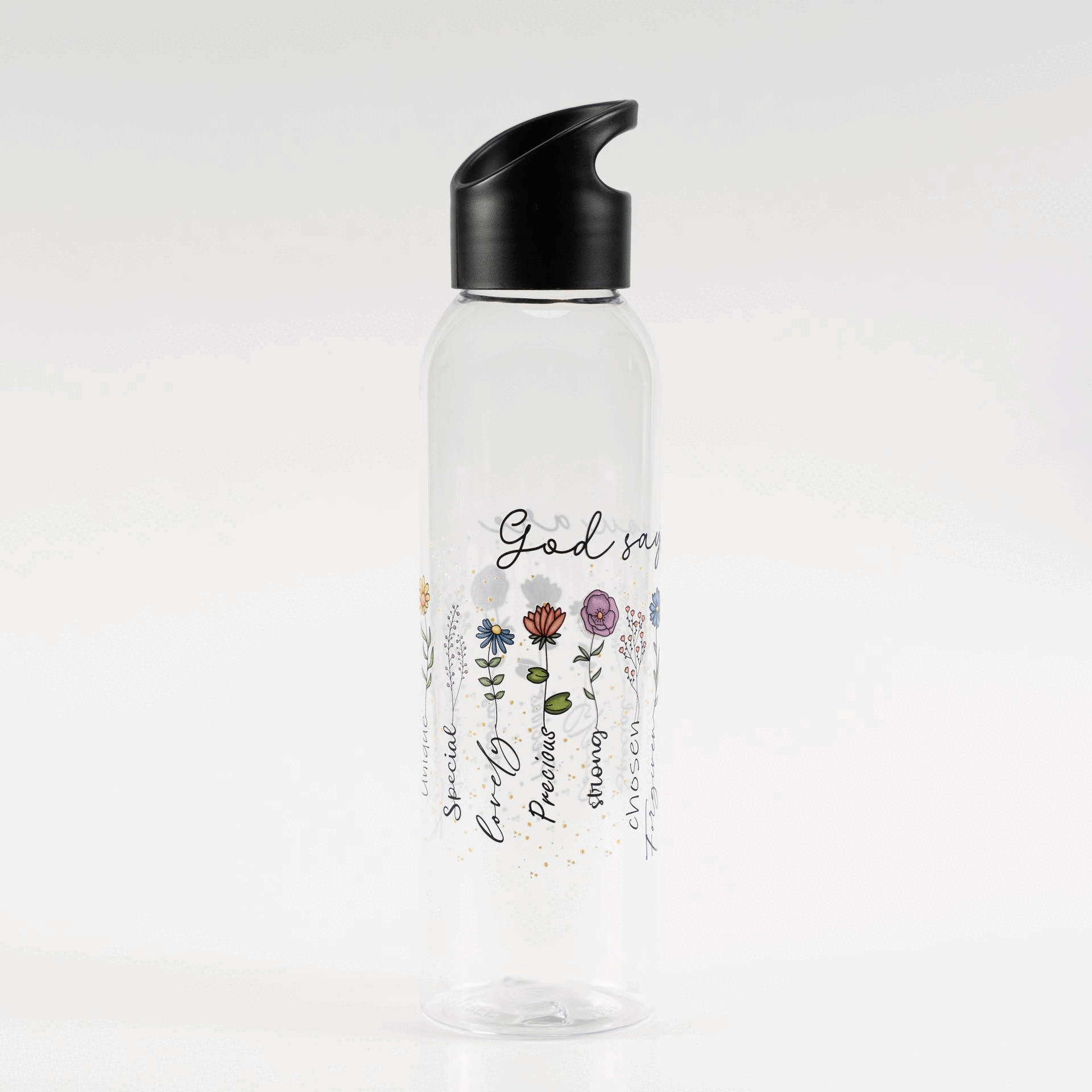 Sticlă de apă din plastic, transparentă cu mesajul: God says you are: forgiven, chosen, strong, precious, lovely, unique, special.