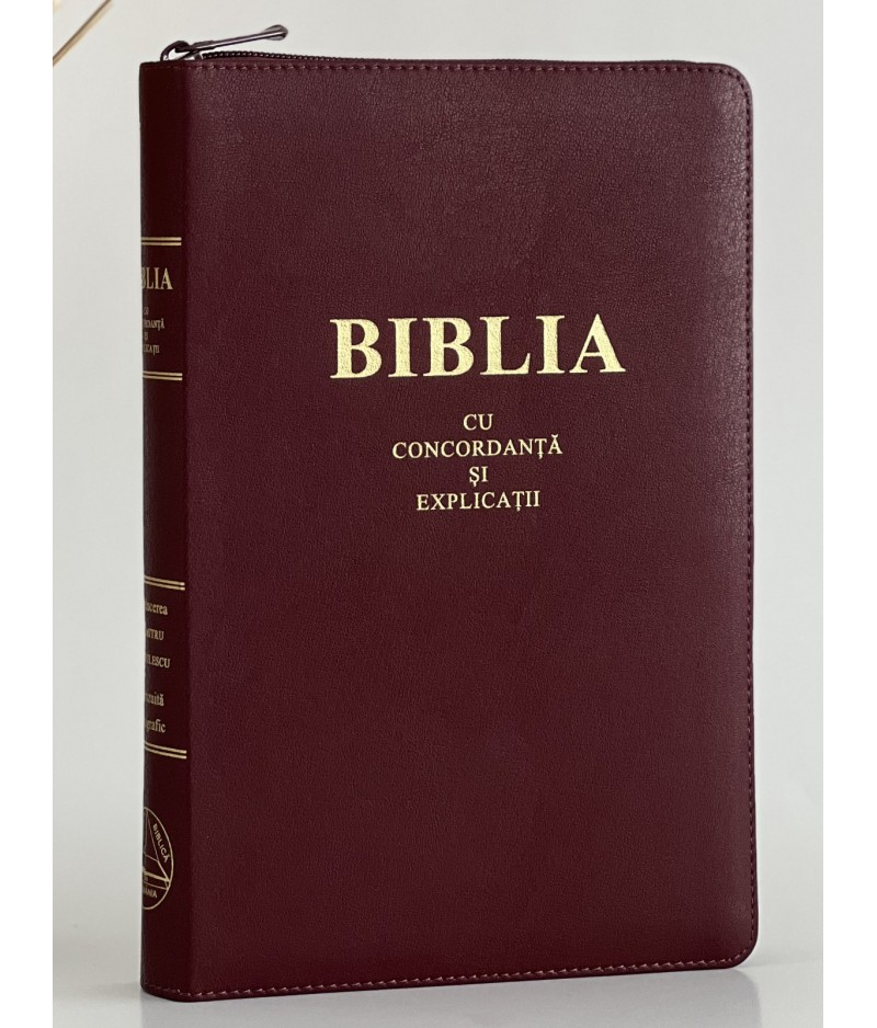 Biblie mare, cu concordanță și explicații, în piele cu fermoar, cu margini aurii și index.