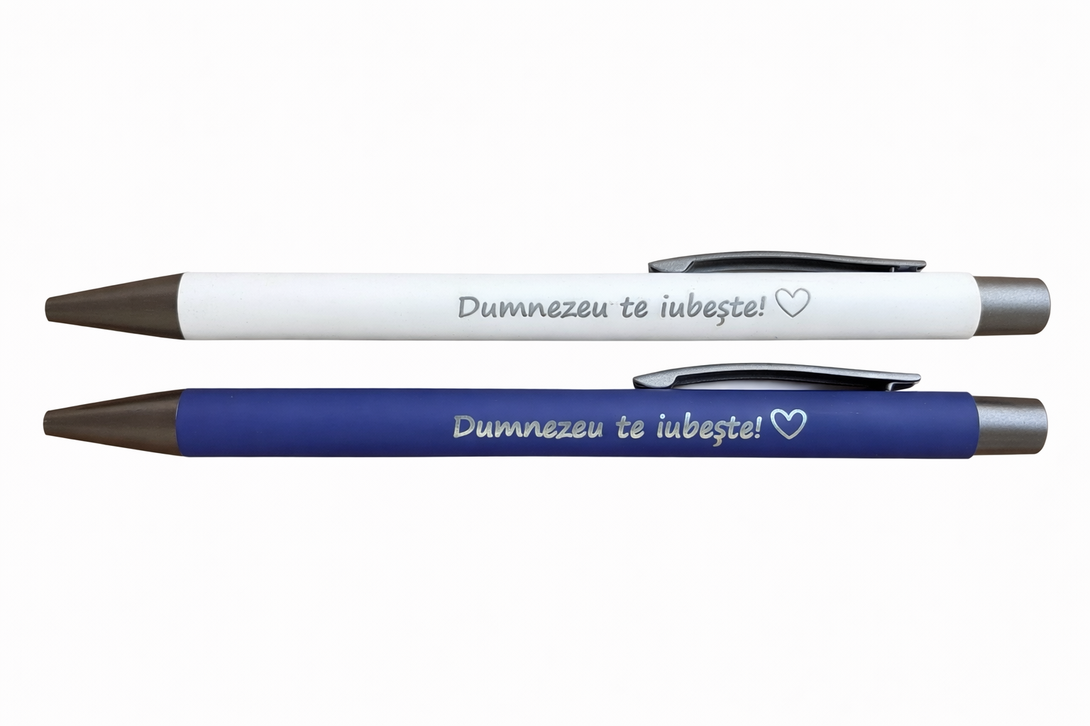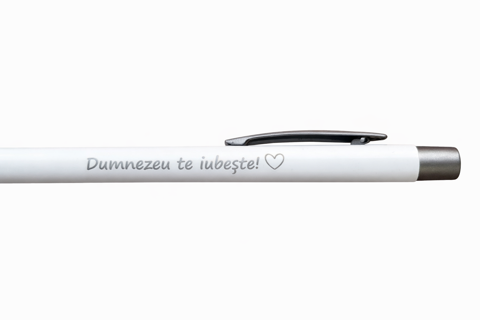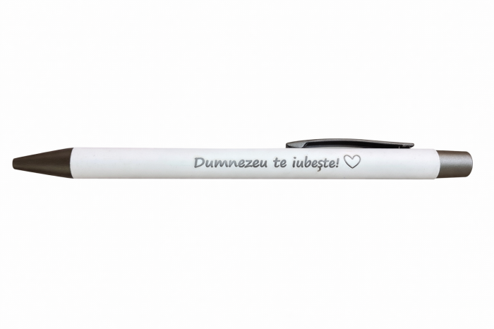 Pe corpul pixului este imprimat mesajul „Dumnezeu te iubeste", realizat într-un font delicat, alături de un simbol discret. Acest detaliu transformă pixul într-un mic obiect cu semnificație, care amintește că Dumnezeu ne iubeste in fiecare zi.