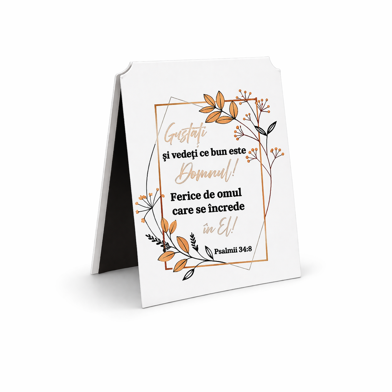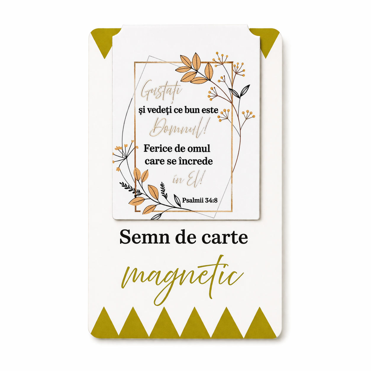 Acest semn de carte magnetic este un accesoriu potrivit pentru oricine dorește să păstreze aproape Cuvântul lui Dumnezeu. Este un mod simplu de a va marca lectura și de a va aminti zilnic: „ Gustati si vedeti ce bun este Domnul!”