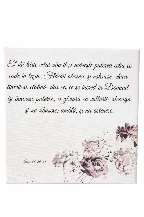 El dă tărie celui obosit și mărește puterea celui ce cade în leșin. Flăcăii obosesc și ostenesc, chiar tinerii se clatină, dar cei ce se încred în Domnul își înnoiesc puterea; ei zboară ca vulturii; aleargă, și nu obosesc, umblă, și nu ostenesc. Isaia 40:29-31