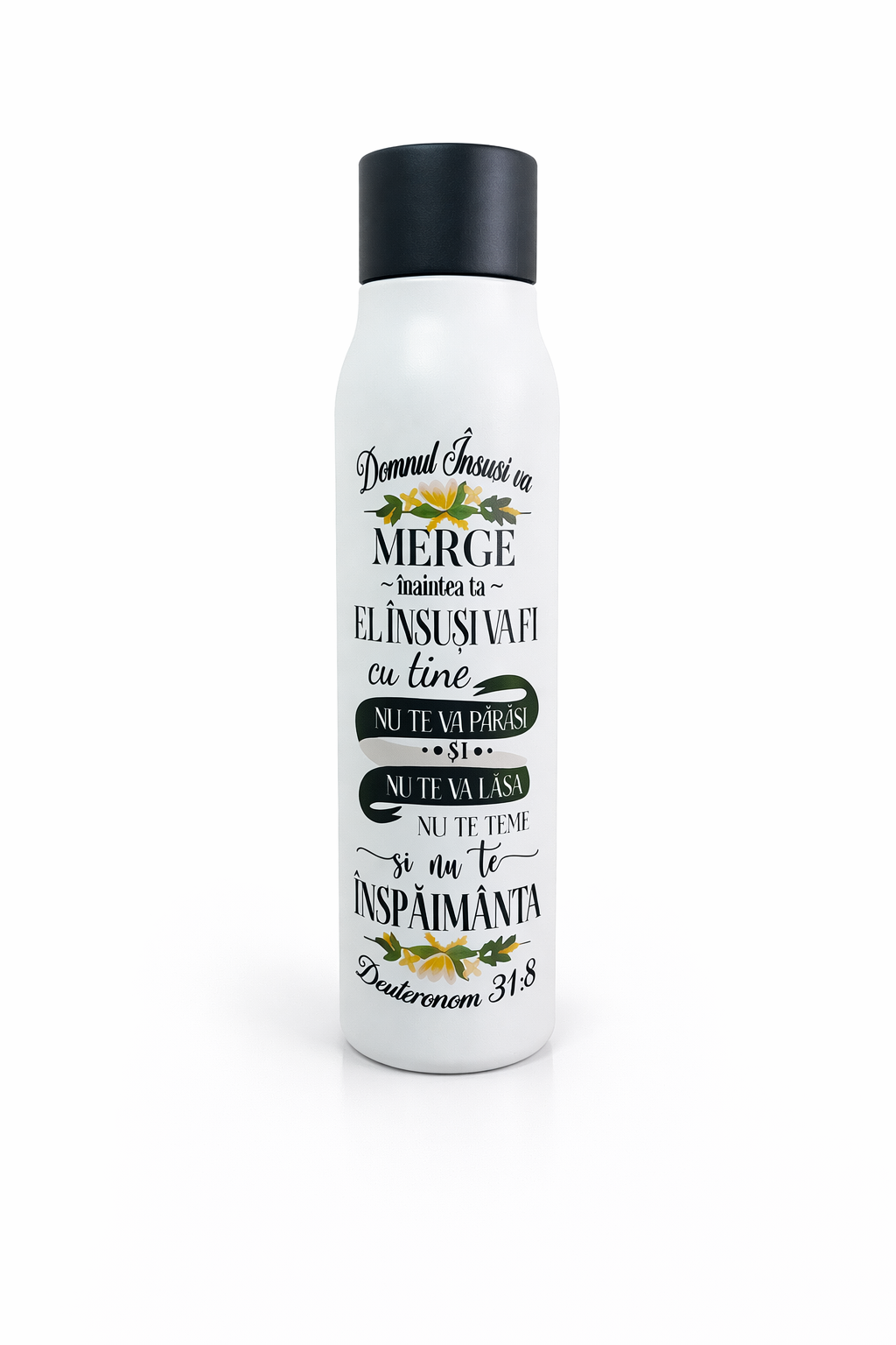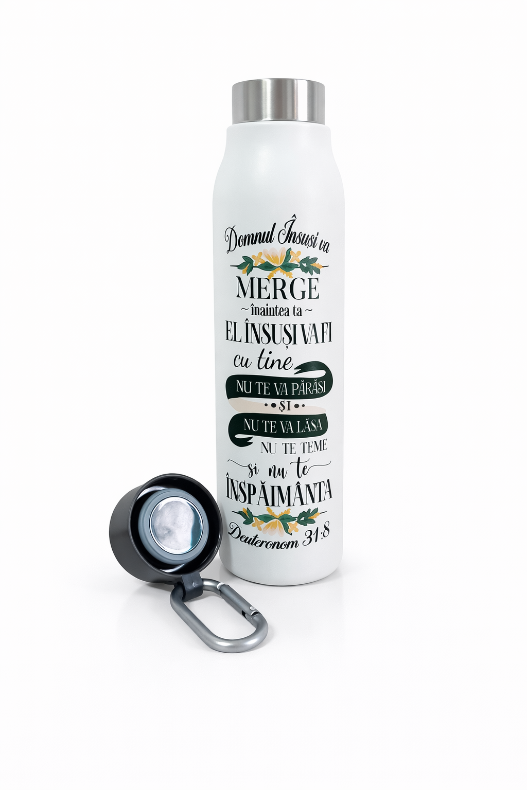 Sticlă pentru băut realizată din oțel inoxidabil reciclat, cu o capacitate de 600 ml, cu textul: Domnul Insusi va merge inaintea ta, El Insusi va fi cu tine, nu te va parasi si nu te va lasa, nu te teme si nu te inspaimanta. (Deuteronom 31:8)